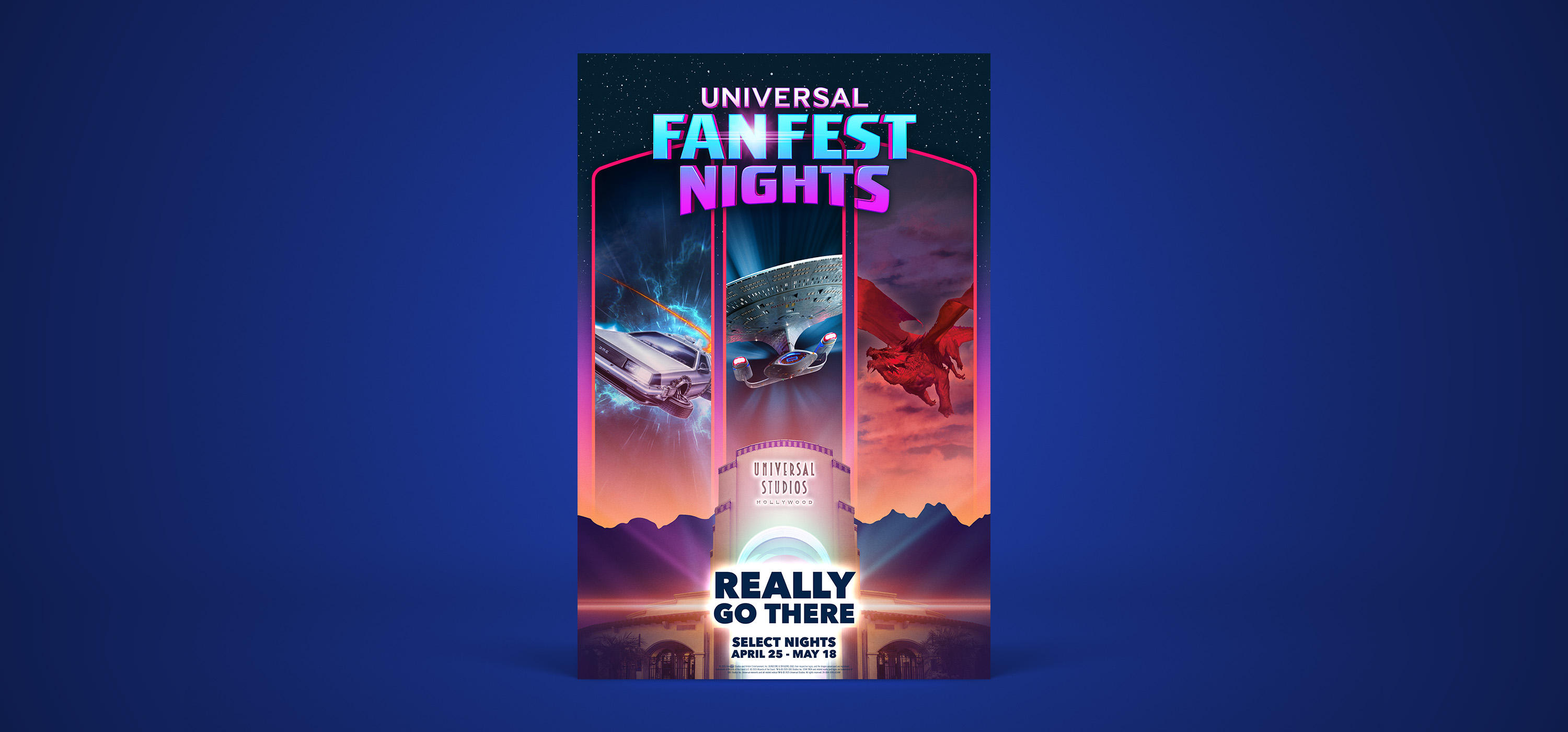 Identity and promotional materials for an evening event series bringing together various fandoms for a shared experience at Universal Studios Hollywood.